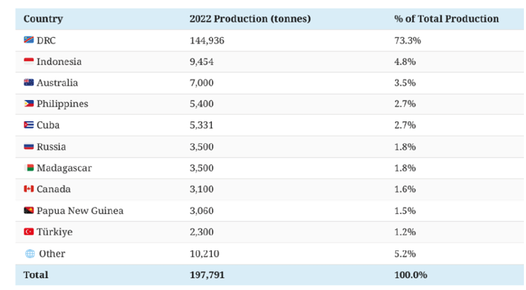 I più importanti minerali di cobalto sono la heterogenite e la cobaltite, ma l’elemento viene anche ottenuto come sottoprodotto dell’estrazione di rame e nichel. I Paesi maggiori produttori di cobalto (Tabella 1) sono la Repubblica Democratica del Congo, da cui proviene oltre il 70% del cobalto mondiale (nella filiera lavorano più di 100.000 lavoratori senza diritti, anche bambini, e non è facile intervenire per cambiare la cosa che si protrae da molto tempo). Seguono come produttori, l’Indonesia, l’Australia e vari altri Paesi.