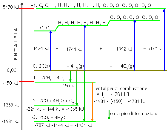 Stato 0 “elementare”: 2C(s); 4H2(g); 4O2(g), posto per convenzione al livello zero di entalpia.