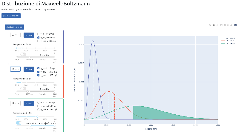 La parte inferiore della finestra è divisa in due aree: a sinistra si trovano i controlli, mentre a destra c’è il grafico. Ogni volta che si fa clic sul pulsante “Aggiungi grafico”, viene aggiunto un nuovo insieme di controlli a sinistra e un nuovo grafico sull’area a destra. Il grafico viene immediatamente aggiornato ogni volta che uno o più parametri vengono modificati, o se viene eliminato un grafico, facendo clic sul pulsante “Elimina”. I valori delle velocità caratteristiche per ogni grafico vengono aggiornati dinamicamente e, se si vuole, sono tracciati come linee tratteggiate sul grafico, come nel caso di He nella figura 1. È possibile calcolare la probabilità per un intervallo di velocità specifico e mostrare il suo valore mentre l’area corrispondente viene riportata sotto il relativo grafico.