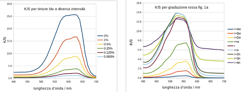 Dal confronto tra i diversi aspetti dei grafici in K/S vs λ su tessuti tinti e sulla carta dipinta (Figura 7), rispetto a quelli in A vs λ su soluzioni di colorante progressivamente diluite (Figura 6), abbiamo potuto descrivere il diverso effetto di desaturazione che si ha miscelando un pigmento colorato con uno bianco o nero, rispetto a una semplice diluizione.