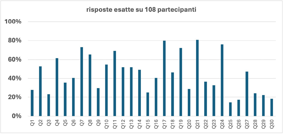 Come riportato nel sito web dei Giochi [9], la fase d’istituto ha visto 27 scuole partecipanti, 1.732 iscritti, 1.692 partecipanti alla prima gara, 1.500 test consegnati. Si è osservato un buon livello di risposte corrette soprattutto nelle domande più vicine alla vita quotidiana. Ad esempio, quesiti come quelli che riguardano l’odore che si avverte nei pressi di una piscina, oppure la formazione della ruggine hanno avuto una percentuale di risposte corrette molto alta, con pochi “non rispondo”, a dimostrazione che gli studenti si sono sentiti coinvolti e motivati a rispondere. Questo tipo di domande, ancorate all’esperienza di tutti i giorni, ha permesso di collegare la chimica alla realtà immediata delle studentesse e degli studenti, rendendo la disciplina più accessibile a tutte e a tutti.