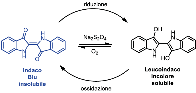 Nello schema 2 è riportato l’equilibrio tra le due strutture del colorante: indaco (forma ossidata fortemente colorata in blu) e leucoindaco (forma ridotta, incolore).