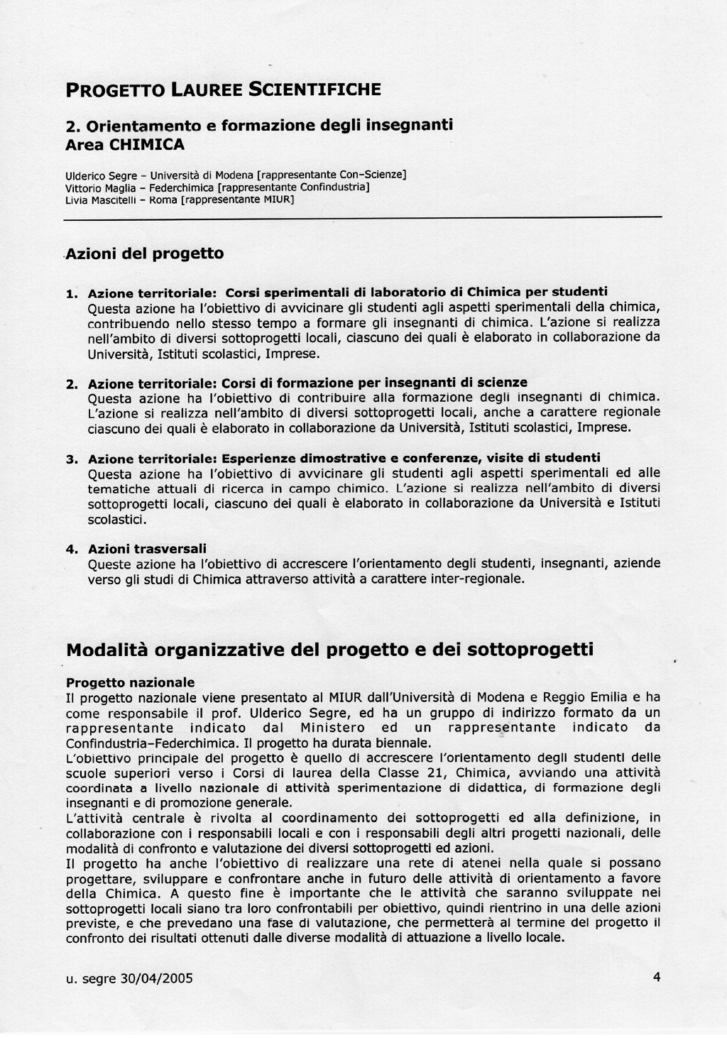 [1] La nascita del PLS-Chimica si può far risalire al documento del 30/04/2005 inviato dal prof. Ulderico Segre alla rete degli Atenei coinvolti nella prima formulazione del Progetto (Orientamento e Formazione degli insegnanti – Area Chimica) che si trova allegato a questo articolo.