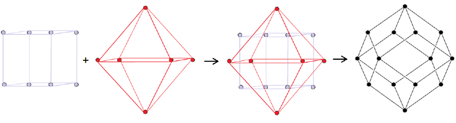 Figura 7. La conversione di ammoniaca (cubo) e acido cloridrico (ottaedro) in cloruro d’ammonio (dodecaedro) secondo la teoria della combinazione chimica di Ampére