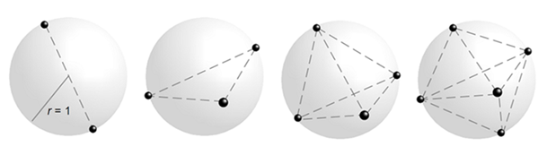 Figura 8. Le strutture risultanti nei casi più semplici del Problema di Thomson con 2, 3, 4 e 5 elettroni sulla superficie sferica di carica positiva di raggio unitario