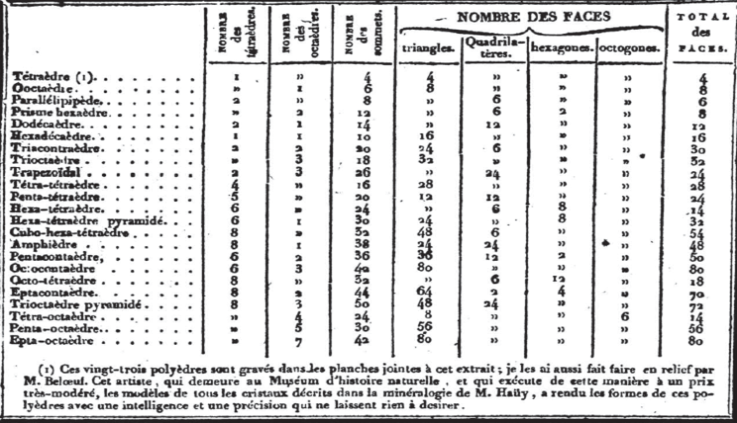 Figura 10. La tabella, acclusa alla Lettre, delle 23 forme rappresentative delle particelle in cui sono specificati il numero di tetraedri e ottaedri combinati e il numero di vertici e di facce del poliedro composto