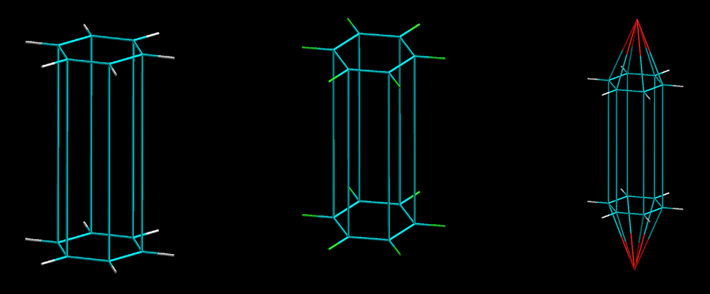 Figura 11. Le strutture stereochimiche del naftalene e suoi derivati di Auguste Laurent, rielaborate in computer graphics (la lunghezza dei legami chimici è arbitraria): il naftalene C12H12, C12Br12 o C12Cl12 e C12H12 + acqua, o acido solforico, o acido cloridrico, rispettivamente da sinistra a destra