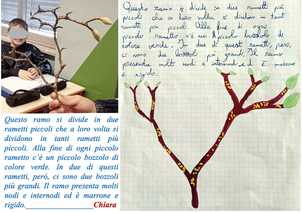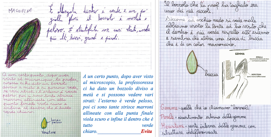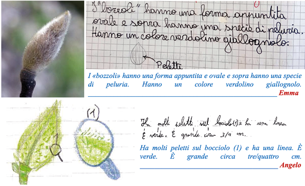 Figura 2. Verbalizzazione scritta individuale con disegno di un ramo di magnolia giapponese (sopra) e descrizioni individuali e disegni dell’aspetto esterno della gemma (sotto)