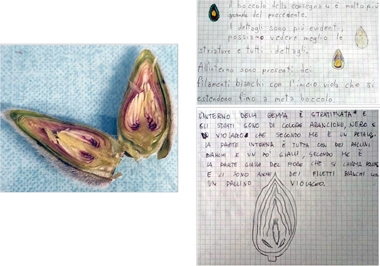 Figura 3. Descrizioni individuali con disegni della parte interna della gemma immatura (sinistra) e descrizione individuale della parte interna della gemma immatura a confronto con lo schema fornito dall’insegnante (destra)