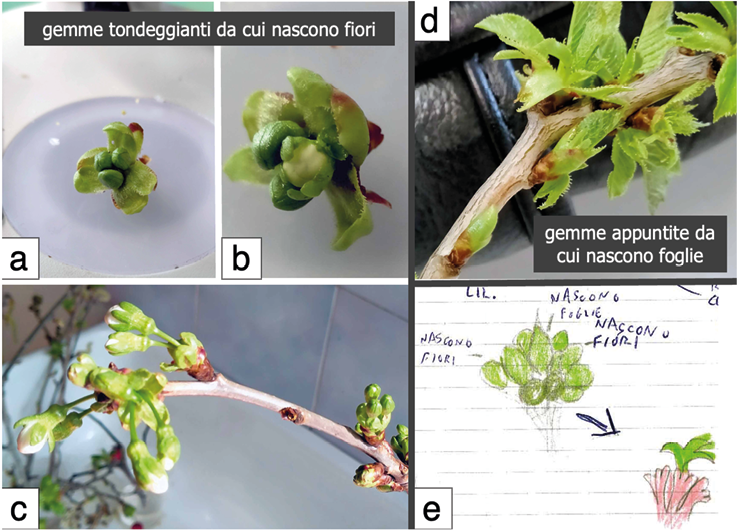 Figura 7. Due rami di ciliegio con gruppi di gemme tondeggianti fiorali (a) e gemme appuntite fogliari (b); parte interna di una gemma tondeggiante e di una gemma appuntita con evidenze rispettivamente di fiori e di foglie (c)