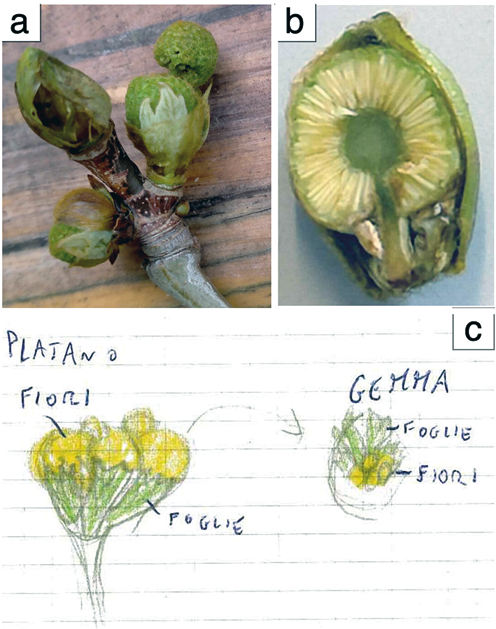 Figura 9. Gemme miste di platano con infiorescenze e foglie (a); infiorescenza all’interno della gemma mista (b); rappresentazione iconica individuale di gemme miste (c)