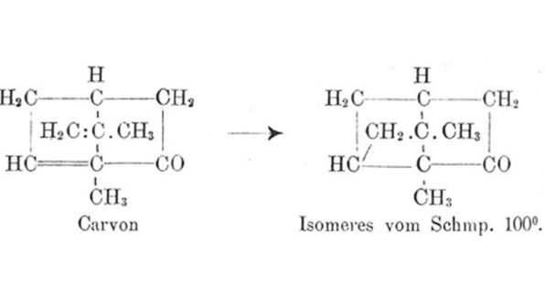 Il prodotto della reazione fotochimica viene poi trattato con acido solforico in soluzione alcolica, nelle condizioni in cui, secondo l’autore, si “compie (…) l’apertura dei nuclei secodarii nei chetoni policiclici e determina in questi la formazione di doppii legami”. Si ottiene un composto ancora isomero del carvone, che mantiene la funzione chetonica e ha un doppio legame (che viene ridotto per reazione con idrogeno).