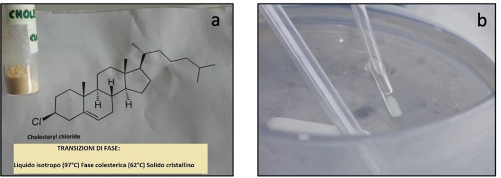 Anche se gli studenti non possono immaginarsi cosa accade realmente, questo semplice passaggio può servire a suscitare nei ragazzi un dubbio, sviluppare delle ipotesi, o semplicemente attirare la loro curiosità sui cristalli liquidi. Tra le prime attività laboratoriali proposte c’è quella di far osservare sperimentalmente cosa succede se riscaldiamo un materiale liquido cristallino (o dalla fase solida, come con il composto derivato del colesterolo di figura 2a) o da una fase liquido cristallina (come nel caso del cristallo liquido nematico, derivato dal cianobifenile in figura 2b).