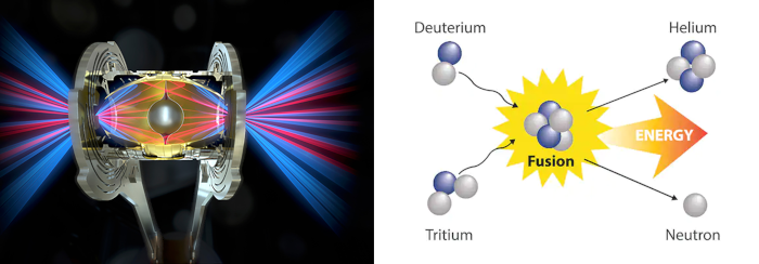 L’altro approccio è quello basato sul confinamento inerziale che consiste nel bombardare con dei potentissimi impulsi laser un piccolo contenitore in cui è presente una miscela solidificata (in quanto freddissima) di deuterio e trizio: si verifica così una intensissima compressione che fa salire contestualmente la pressione e la temperatura (fino a una sessantina di milioni di gradi), tanto da innescare la fusione.